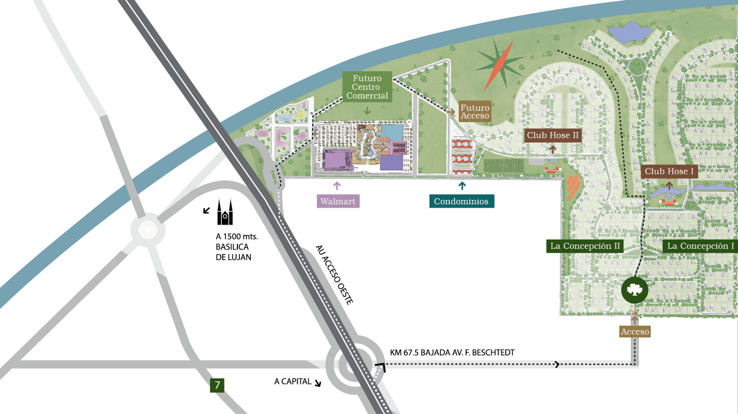 Está formado por dos clubes de campo adyacentes a un centro comercial y de entretenimiento. A sólo 40 minutos de la ciudad de Buenos Aires un solar privilegiado de casi 130.000 m2, emplazado en la intersección del Acceso Oeste y el río Luján.